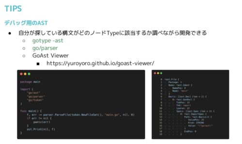 遅くなってしまいましたが、11/26(火)にgolang.tokyo#37で登壇しました。 speakerdeck.com 今回が初めてのオフラインでの登壇だったので少し緊張しましたが、懇親会で直接感想をいただけたのが嬉しかったです。 登壇内容について Goの静的解析をテーマに登壇…